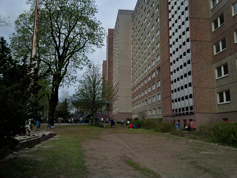 I am staying in a neighbourhood on the edge of where the spread of socialist plattebau housing begins. Still undesirable for the gentrification game. I move into an apartment on the 10th floor of an ex-GDR housing block at Ruschestrasse Lichtenberg to be met by views I did not expect. They look straight into the old Stasi headquarters that now serve as temporary housing for Syrian refugees. It’s like having a ringside seat wherein I can peer into their privacy.